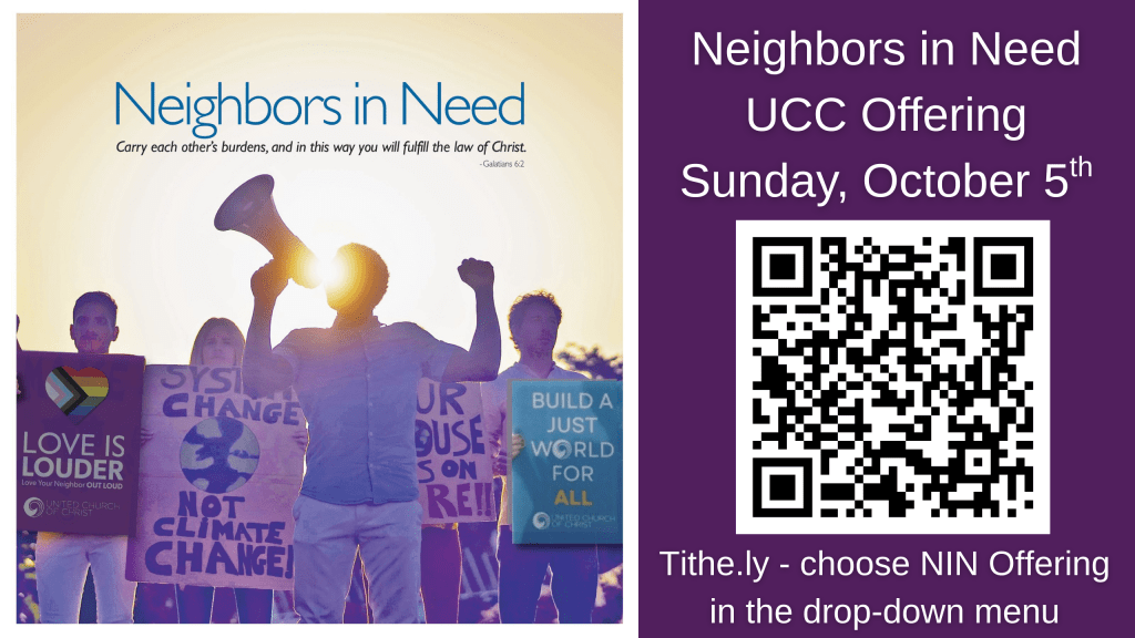 The Neighbors in Need offering supports ministries of justice and compassion, with one-third of the offering given to the Council for American Indian Ministries and the remaining two-thirds supporting UCC justice ministries. In 2025 the Neighbors in Need Offering supported 26 grant recipients across the UCC who were engaged in projects of direct service and advocacy. Thank you for your support and generosity! You can send us a check, or donate via Tithe.ly – choose NIN Offering in the drop down menu.