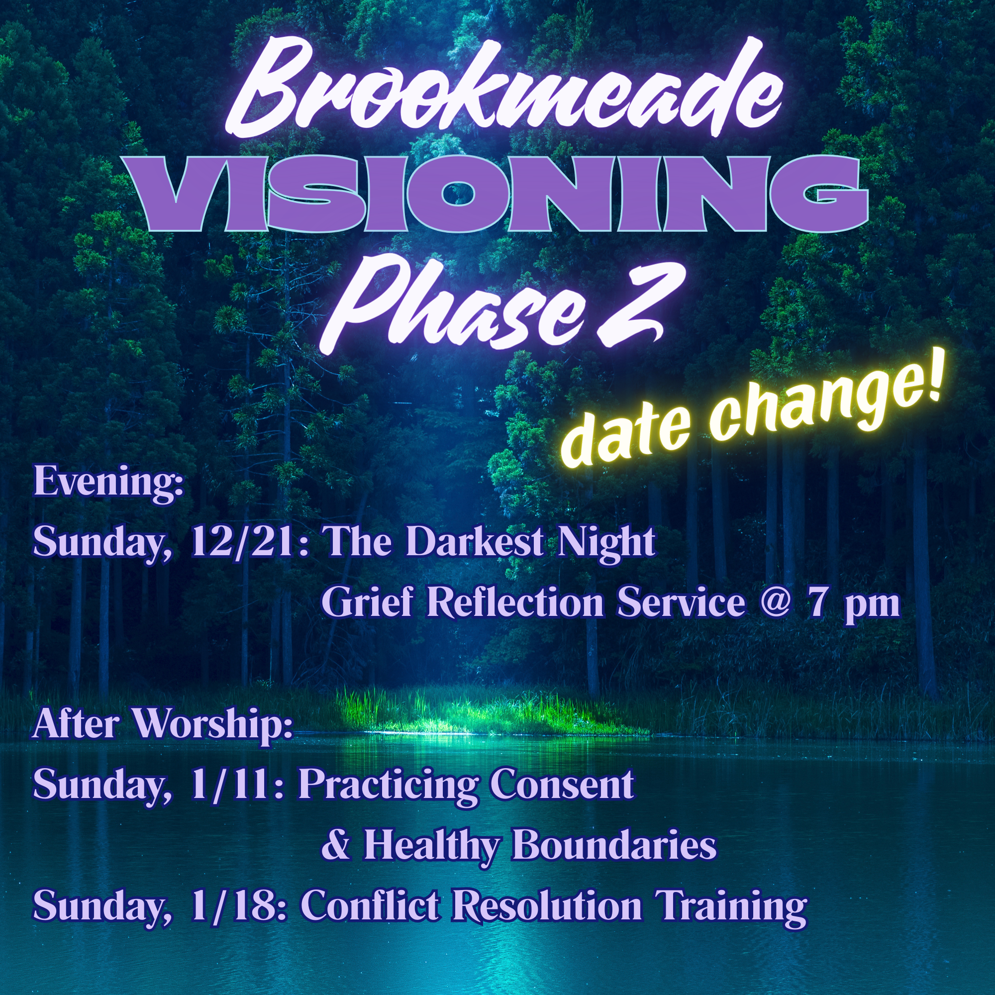 After some thoughtful and prayerful discussion, Pastor Liz and leadership have decided to POSTPONE the second half of the Visioning Phase 2 process until after the beginning of the new year. We will still have our Darkest Night Service on Sunday, December 21st, at 7 pm in the sanctuary. This will be a reflective service with prayer stations and an opportunity to consider grief in the midst of the season of holidays (Holy Days).