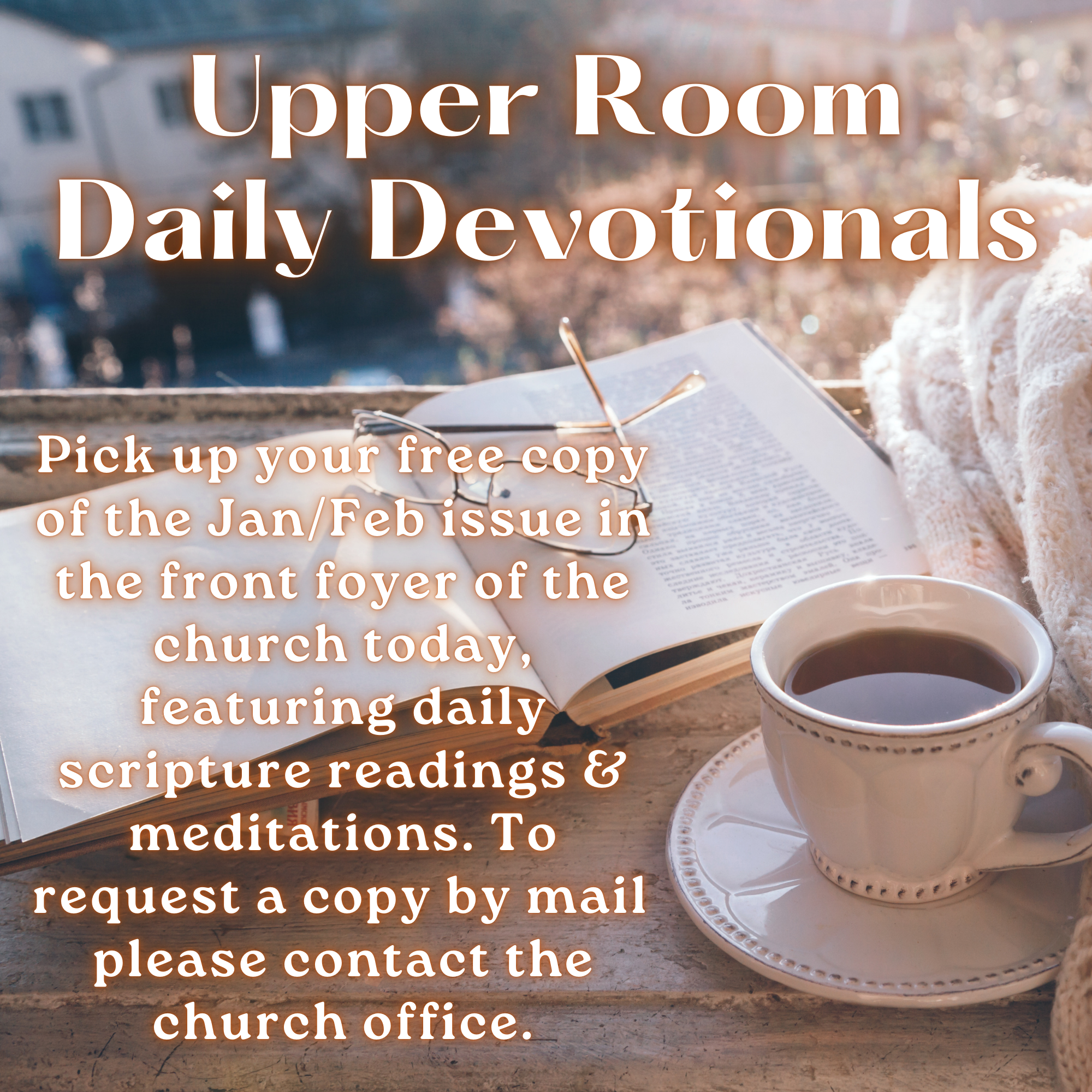 Start the new year off right by picking up a copy of the new January-February UPPER ROOM daily devotional, now available without cost in the foyer of the church, to have daily set-aside time for prayer & meditation on sacred scriptures in the new year! Pick up the UPPER ROOM in the foyer of the church, or contact the church office to have a copy mailed to you.