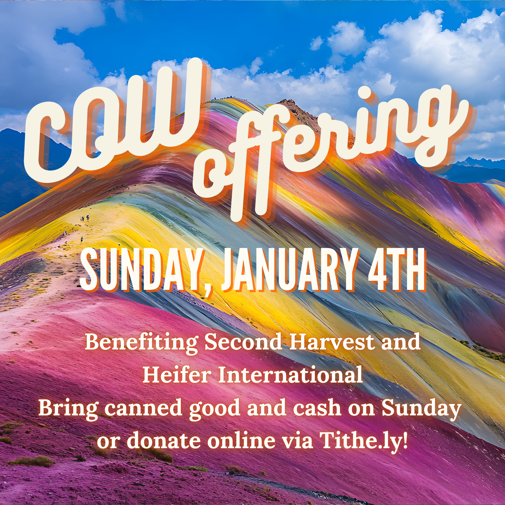 Our usual monthly COW Offering benefiting Second Harvest Food Bank and Heifer International will be Sunday, January 4th. Bring canned goods and cash to donate Sunday or give online via Tithe.ly (choose COW offering in the drop-down menu).