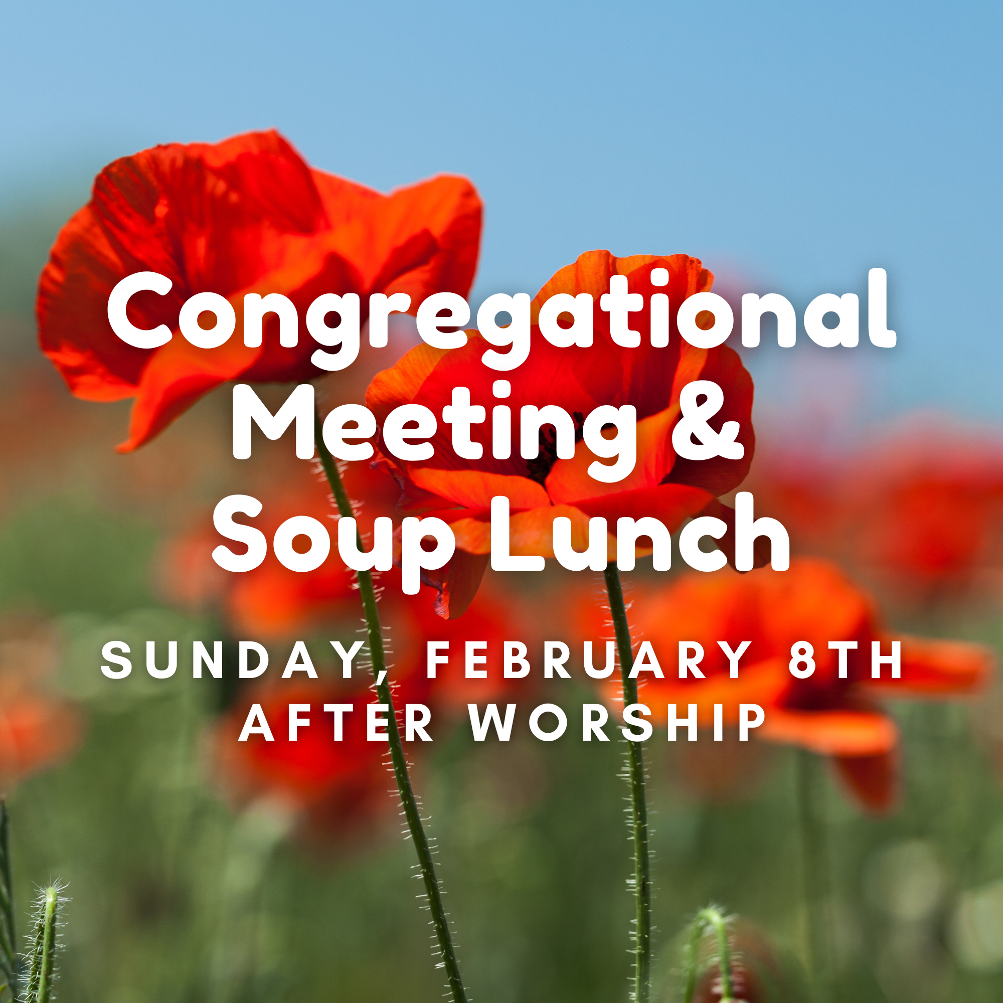 As of now, we are still planning to hold our Congregational Meeting on Sunday, February 8, 2026. We will meet as a congregation following worship to receive reports, a budget, and a slate of officers for congregational approval. We will need a quorum present to make the business of the church move forward, so we ask that you mark your calendar and share your gift of presence and covenantal support for the ministry we continue to live into. Because it is Souper Bowl Sunday, we will dedicate the soup that has been collected for Second Harvest Food Bank, and we will share in some delicious homemade soups provided by members. If you would like to bring a soup to share or some sides (bread, sweet things, alternative ideas), we welcome the spirit of abundance and sharing that allows all to share in the blessings God provides. We look forward to seeing you all and discussing the next steps in our visioning work and the building of a strategic plan for ministry.