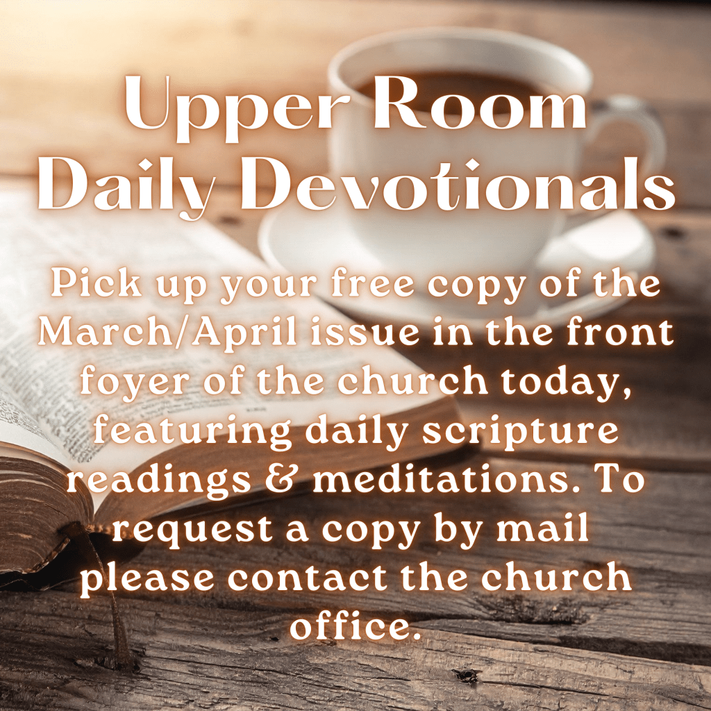 The UPPER ROOM daily devotional for March-April is now available without cost in the foyer of the church, or contact the church office to have a copy mailed to you. As we enter the Lent & Easter seasons, the UPPER ROOM is a great devotional aid to be closer to God in everyday life. In these challenging times, we can and need to be close to God through prayer and meditation on sacred scriptures in our daily lives.