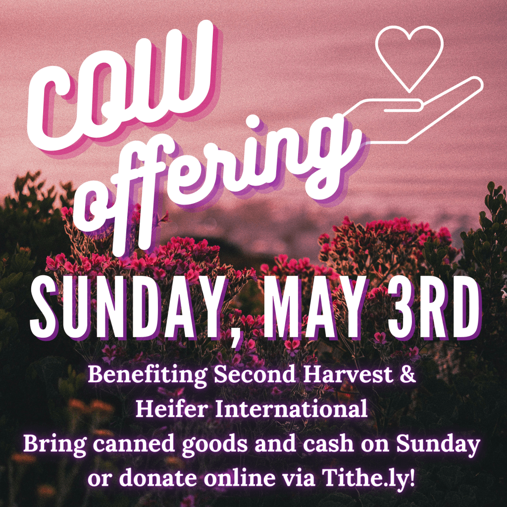 Our next COW Offering (collected on the first Sunday every month) is Sunday 5/3! “Contribute Our Wealth” benefits Second Harvest Food Bank of Middle TN and Heifer International. Help Brookmeade fight hunger in the Nashville and wider world community by donating canned goods, cash or check, or donating via Tithe.ly (choose COW Offering in drop down menu). Thank you for your generosity!
