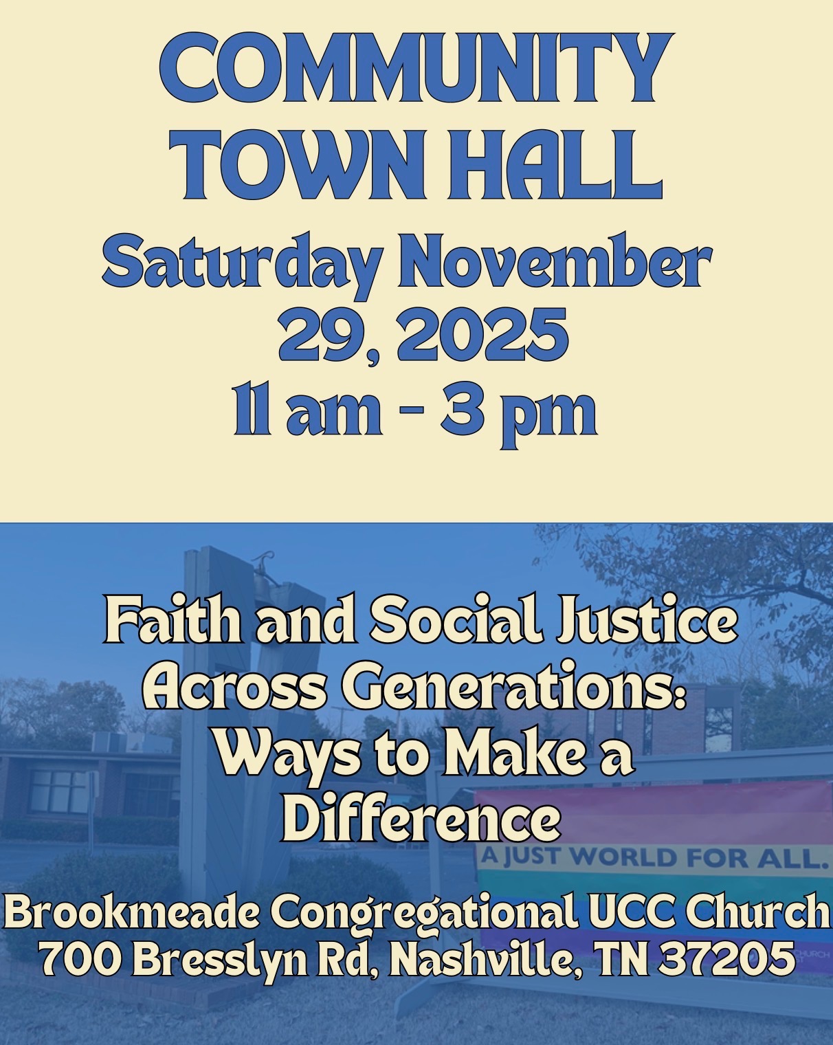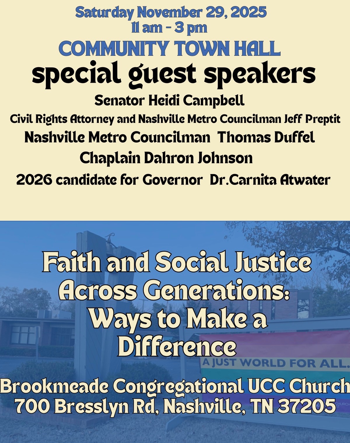 “Diverse Unity Nashville” is holding a Community Town Hall at the Brookmeade building on Saturday, November 29th starting at 11 am, with a reception following. Come hear local guest speakers talk about important issues facing our community. Speakers will include: Senator Heidi Campbell, Council Member Thomas Duffel, Chaplain Dahron Johnson, Council Member Jeff Preptit, Candidate for Governor Dr. Carnita Atwater. Please spread the word about this community event!