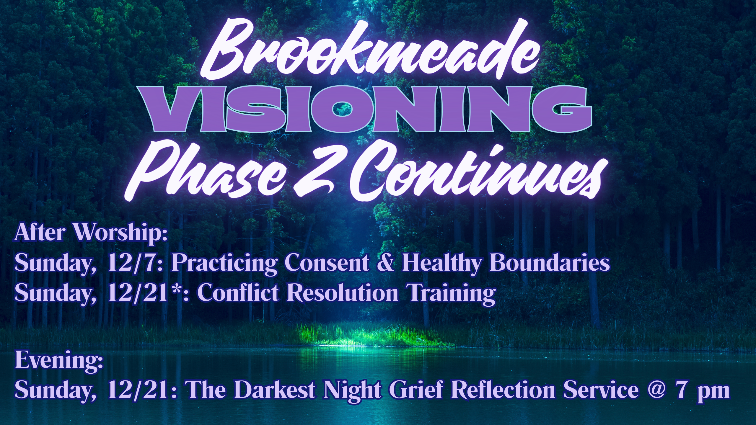 The second phase of our Visioning process has included some grief work and will still include some congregational/covenant-building work. Pastor Liz has used her training and experience to organize four after-worship sessions that began Sunday, November 9th. We will continue the second part of this work on Sunday, December 7th, with a session on Practicing Consent and Healthy Covenantal Boundaries. Followed by a session on December 21st (*notice change of date) working on Conflict Resolution Training. Pastor Liz intends to help us build tools for building a stronger and healthier covenant for moving forward. This work may include some challenging conversations, so we invite you to be brave and welcome the opportunity to grow as we learn together. Be brave, take a risk, and come join in the Visioning work that lays a foundation for the ministry God is calling Brookmeade to become. We need your voice and your knowledge. And we hope your love for this institution and its people will be enough to draw you to the good work ahead of us. Once we complete Phase 2, Phase 3 will begin in late January or early February, and in this phase, we will begin the work of naming God’s mission (the purpose for our ministry) and God’s vision (the direction that mission will take) for our future ministry. This is the fun work, the dreaming, the brainstorming. It will really help us all be on the same page if we don’t skip any steps along the way. Let us continue this journey in ministry and allow God to show us how good it can get!