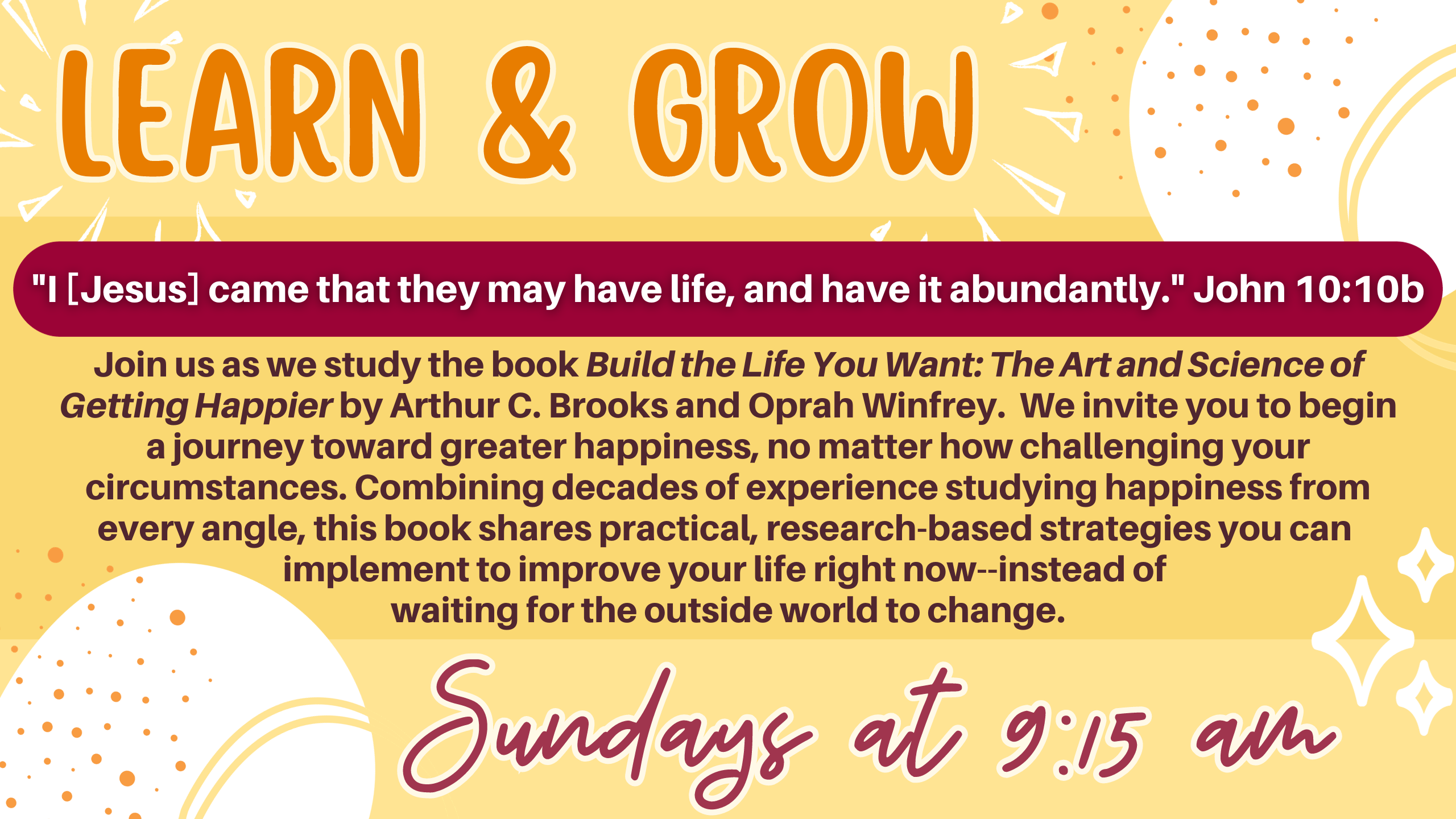 Our Learn & Grow class meets weekly on Sunday mornings at 9:15 am! Learn & Grow is an adult Sunday school class that explores a wide variety of topics. Our current study is based on the the book Build the Life You Want: The Art and Science of Getting Happier by Arthur C. Brooks and Oprah Winfrey.